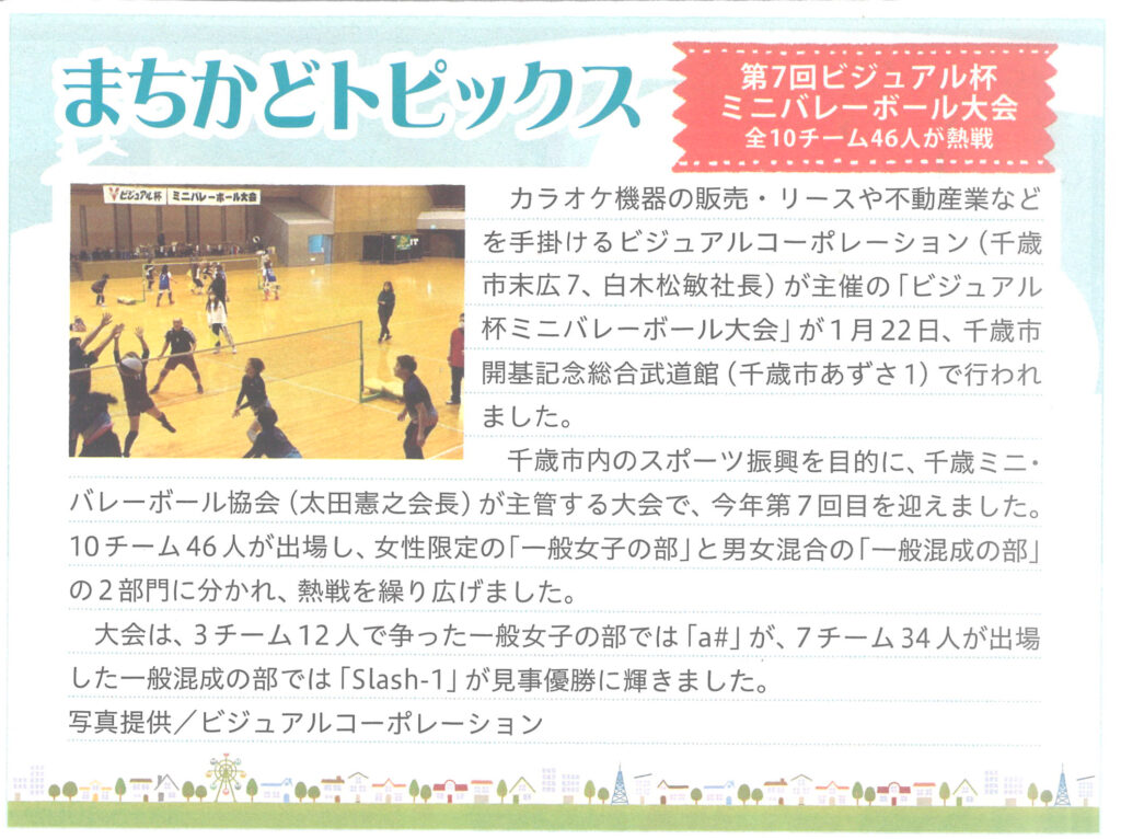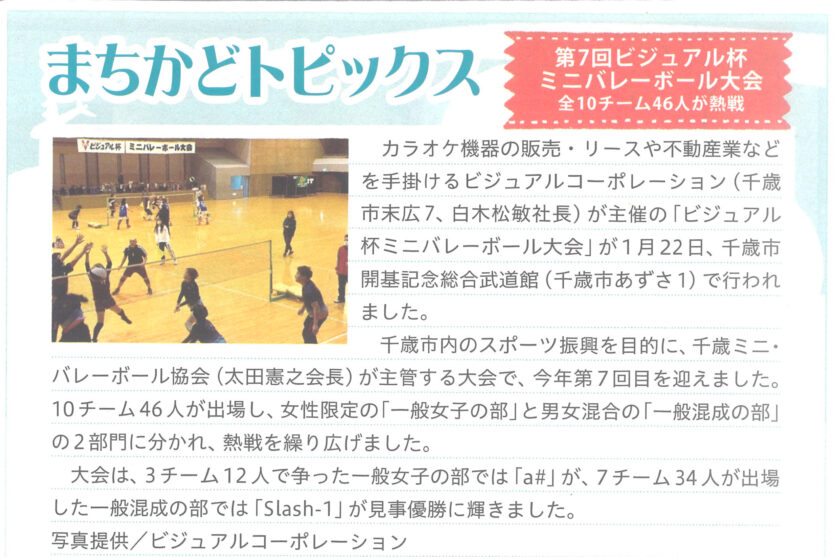 「ちゃんと」にて第7回ビジュアル杯ミニバレーボール大会の記事が掲載されました。 2023年2月9日 by visual2024y / 0件のコメント 2023年2月10日生活情報誌「ちゃんと」に 第7回ビジュアル杯ミニバレーボール大会の記事が掲載されました。